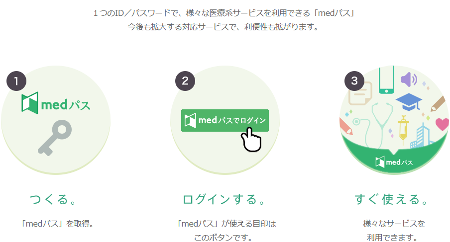medパスは、複数の医療サイトで共通して利用可能な「医療関係者の共通ID」です。
